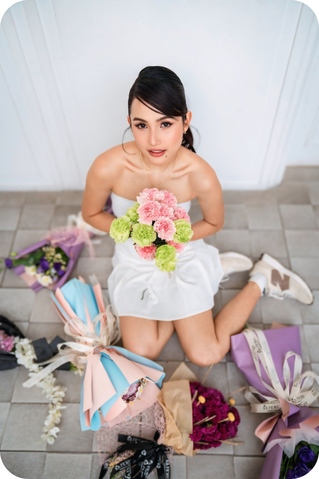 As a mom of two, things got tough after having my second baby, it was a lot to handle, and who knew that some leftover flowers that I took home from a wedding we attended, was my turning point to greatness. At my lowest, I stared at these flowers sitting on my counter top and somehow decided to pick myself up and turn the lifeless blooms into something meaningful, I had no idea what I was doing, but I felt time stopped as I did this. My tears suddenly dried and I was unconsciously smiling. This was my very first arrangement ever, and to my surprise, after getting lost in time, it turned out better than I expected. Ever since then, my love for floral artistry and flowers itself has been endless. It made me realize that we choose how our life goes, and we can make that decision to make something lifeless into something that can bloom and flourish. These flowers were withered and almost considered trash, but after a few hours in the water and reconditioning them, they started to look alive again and bloomed into the most beautiful most colorful arrangement that I didn't know was capable of doing.